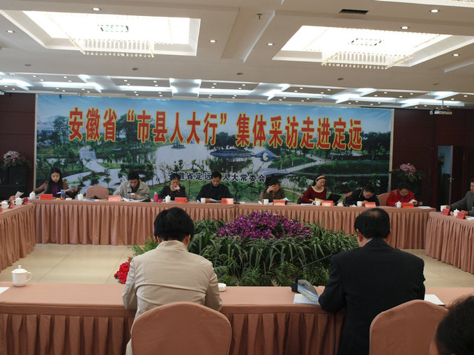 采访团先听取了县人大常务副主任李国才对定远县人大常委会开展代表工作的汇报。省人大研究室宣传处宋处长对充分肯定了定远县人大常委会的工作成绩。随行的采访记者对定远县在代表工作中的一些做法如按代表提议建设的留守儿童学校、代表在美好乡村建设发挥的重要作用、以及代表的示范带头作用等很感兴趣。采访记者自行选取了定城镇代表活动室、张桥镇留守儿童学校、蒋集镇等三个点,重点采访人大文化长廊建设、代表接待选民“一个遵守两不固定”做法、代表向选民述职评议、代表发挥带领选民致富奔小康作用等内容。
